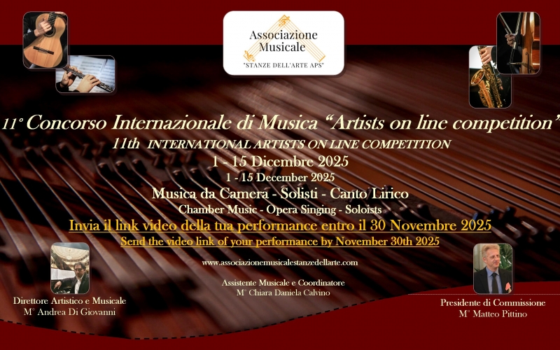 L'Associazione Musicale "Stanze dell'Arte" ETS organizza il Concorso Internazionale di Musica " Artists on line competition" giunto alla decima edizione. L’Associazione è tra le prime organizzazioni in Italia e all’estero a proporre già nel 2016 la prima edizione di un Concorso musicale interamente on line. Nasce con l’obiettivo di dare l’opportunità a musicisti del panorama Nazionale ed Internazionale di farsi conoscere anche attraverso i più moderni canali web.